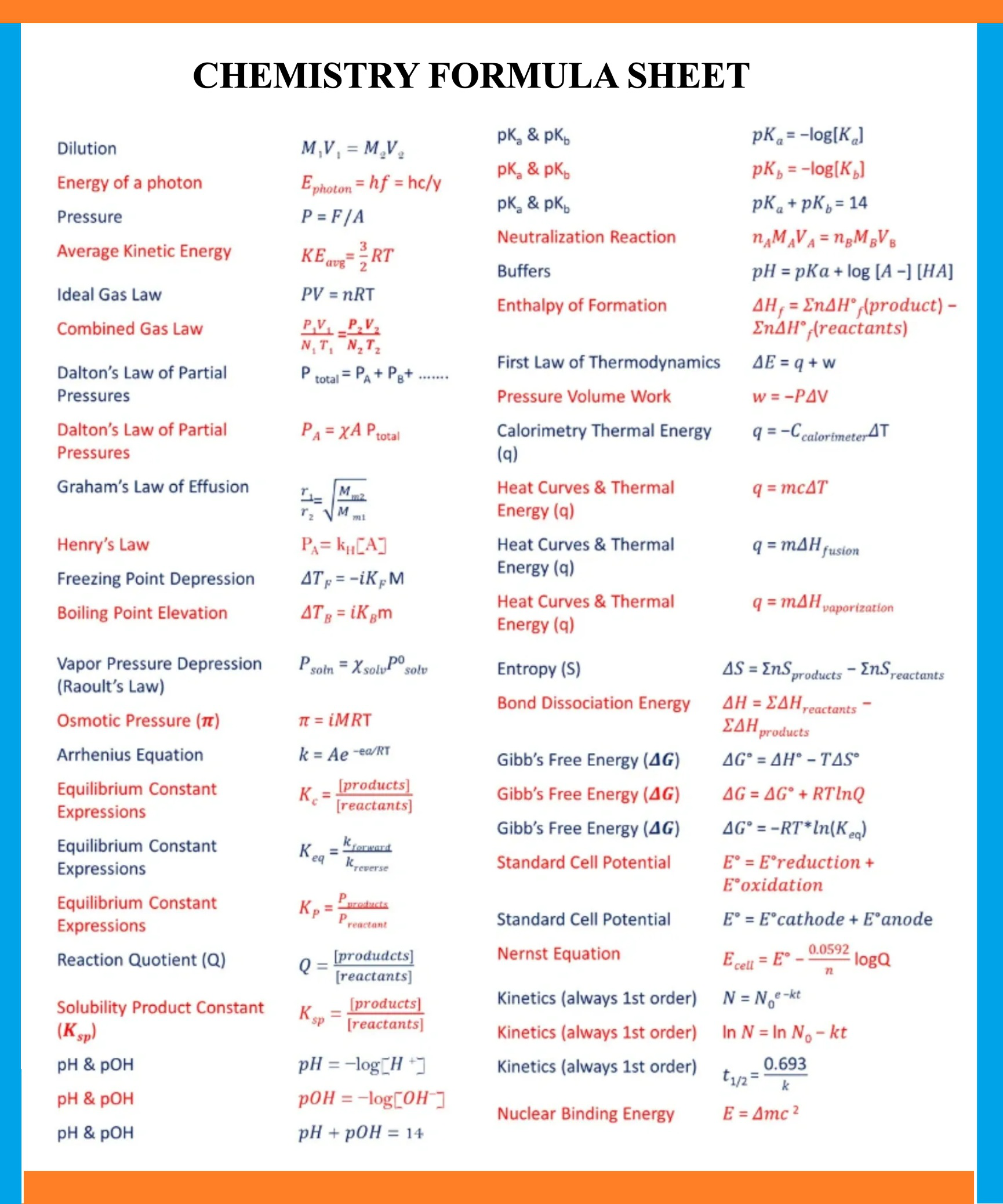 This chemistry formula sheet is the standard formula sheet accepted & used in the following district school boards: York Region District School Board (YRDSB), Toronto District School Bard (TDSB), Toronto Catholic District School Board (TCDSB), Peel District School Board (PDSB), Durham Catholic District School Board (DCDSB), and Ontario Private School Boards. In general, for all of Canada, including district school boards in the provinces, Ontario, British Columbia, Alberta, Québec, etc., this chemistry formula sheet is accepted in its entirety, including but not exclusive to, the chemistry formulas in the various chemical science disciplines.