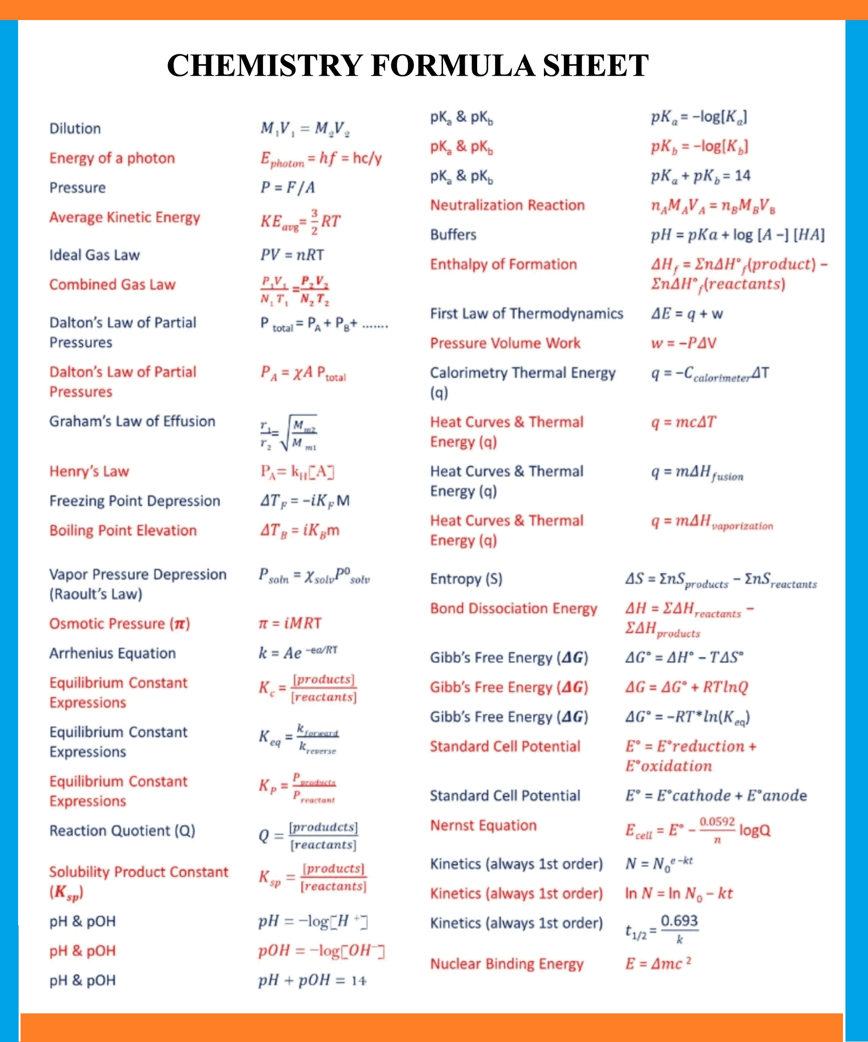 American College Chemistry Formula Sheet (follows the American Version) for all Colleges in America